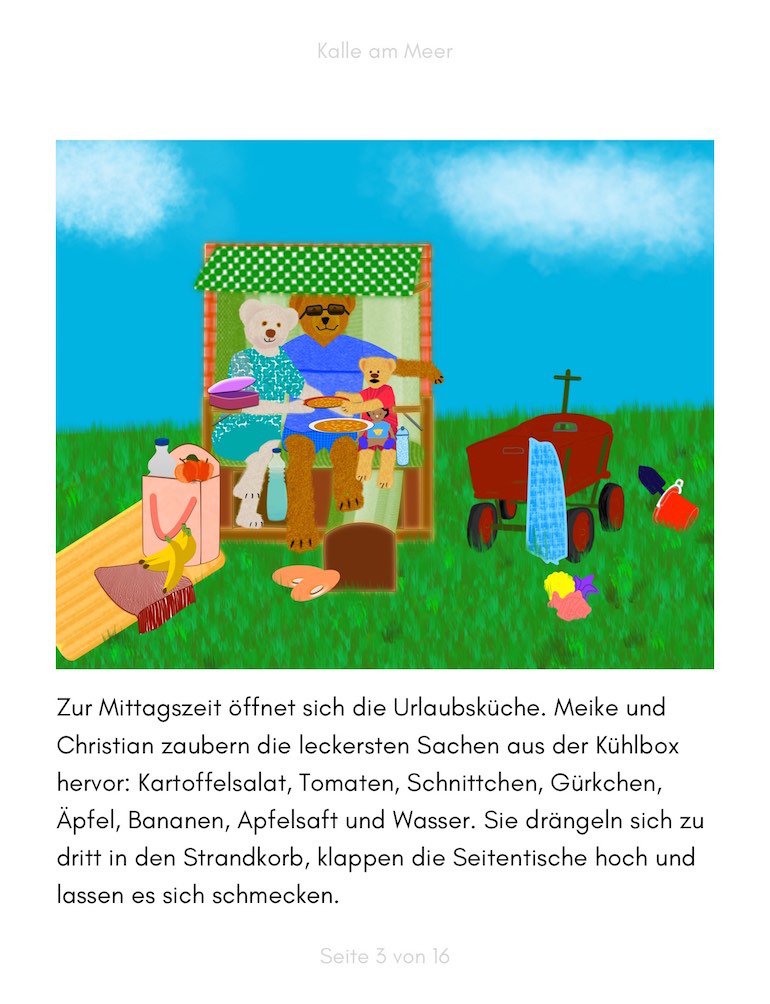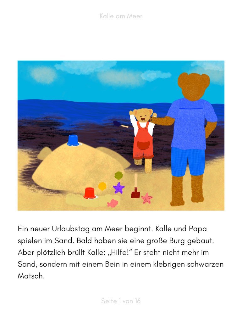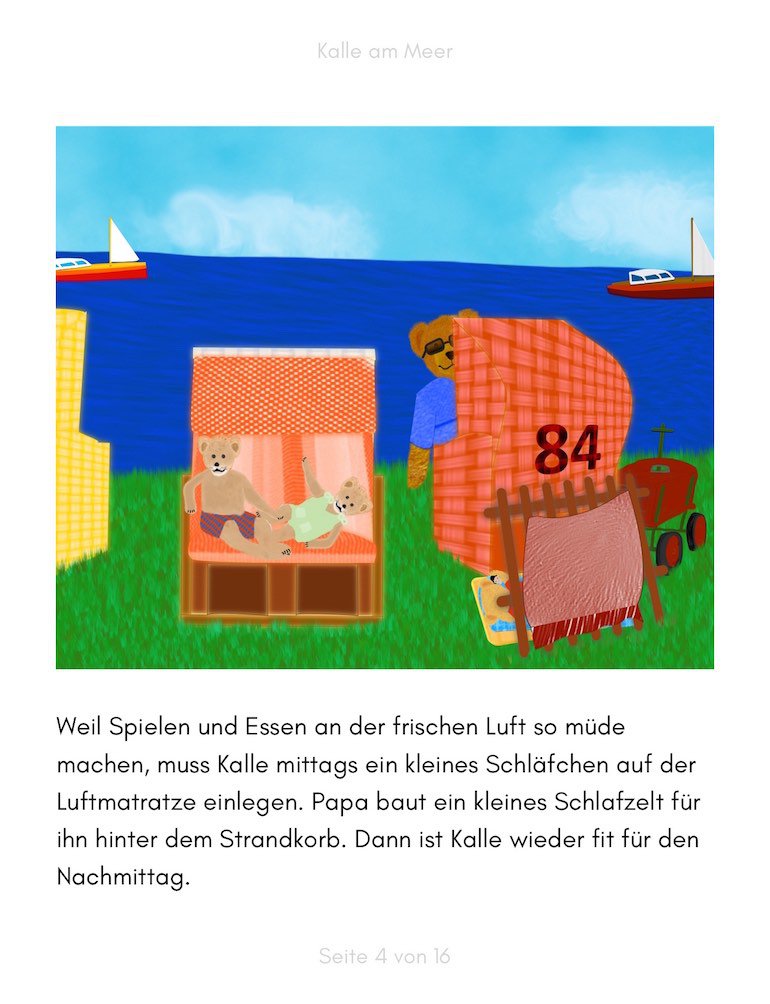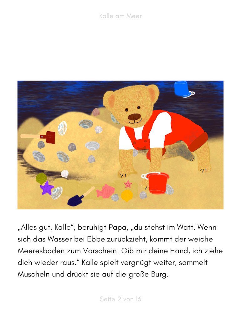 Die Nordseeküste hält viele Abenteuer für den kleinen Bären bereit. Kalle macht die ersten Schritte ins Meer und findet nach anfänglichem Zögern großen Spaß daran, seine Eltern nass zu spritzen. Bei einer Rundfahrt mit der Bimmelbahn erkundet die Familie die Gegend. Allmählich bekommt Kalle Hunger, muss aber seine Tüte Pommes vor einer diebischen Möwe verteidigen.