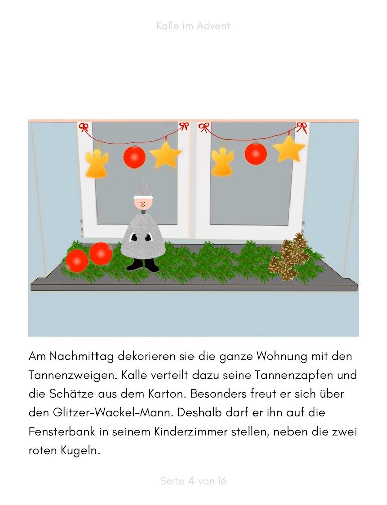 In der Adventszeit ist für Kalle auf einmal alles anders. Er hilft seinen Eltern die Wohnung mit Tannengrün und glitzernden Kugeln zu dekorieren. Ihren Nachbarn bereiten sie abends heimlich eine Überraschung. Beim Waldbauern kaufen sie einen schneebedeckten Weihnachtsbaum. Als Kalle zum Plätzchenbacken bei seiner Freundin Mia ist, bekommen sie Besuch von einem seltsamen Mann im roten Mantel.
