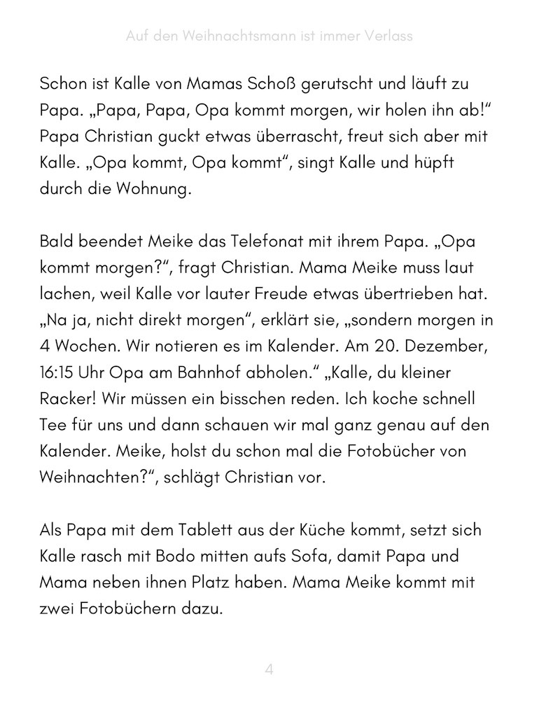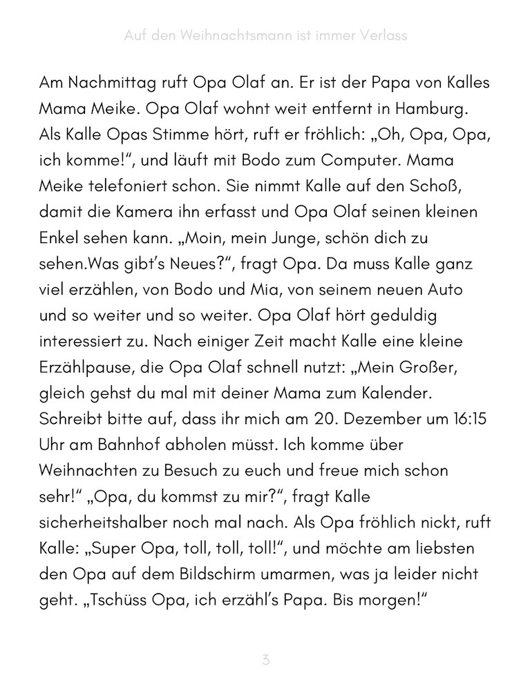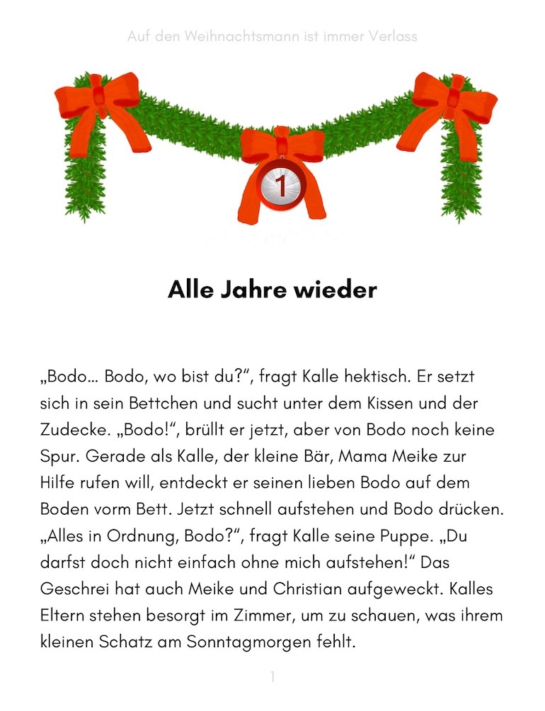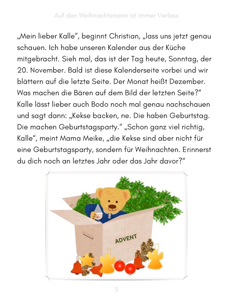 Kalle, der kleine Bär, wartet gespannt auf den Weihnachtsmann. Die aufregende Vorweihnachtszeit vergeht rasch: Kalle sucht Zapfen im Wald, kauft Tannenzweige beim Waldbauern, dekoriert sein Zimmer, begrüßt den Nikolaus, schreibt seinen Wunschzettel, backt Kekse, baut eine Schneefrau, wird krank und wieder gesund, freut sich über Opas Besuch und fährt Karussell mit ihm auf dem Weihnachtsmarkt, trifft den Weihnachtsmann im Parkhaus. Dann ist endlich der Heiligabend da. Wird der Weihnachtsmann noch zu Kalle kommen?